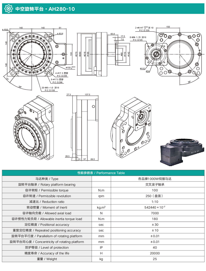 中空旋轉(zhuǎn)平臺(tái)是一種全新的旋轉(zhuǎn)負(fù)載裝置,它集高傳動(dòng)效率、高精度、高剛性、高性價(jià)比與一身,綜合了伺服馬達(dá)、凸輪分割器直驅(qū)馬達(dá)的優(yōu)勢(shì)。使用高精度齒輪結(jié)構(gòu)和徑向軸承,提高了扭矩和剛性,承載更穩(wěn)重,搭配伺服馬達(dá)或步進(jìn)馬達(dá)可做任意角度分割,即可滿足分割器無(wú)法實(shí)現(xiàn)的位數(shù)控制,定位精度又可媲美直驅(qū)馬達(dá),可在段時(shí)間內(nèi)實(shí)現(xiàn)慣性負(fù)載的定位。