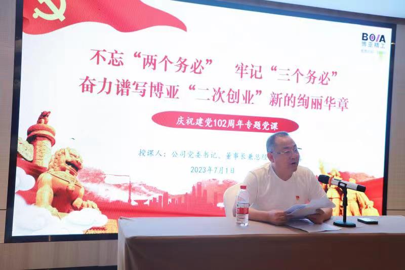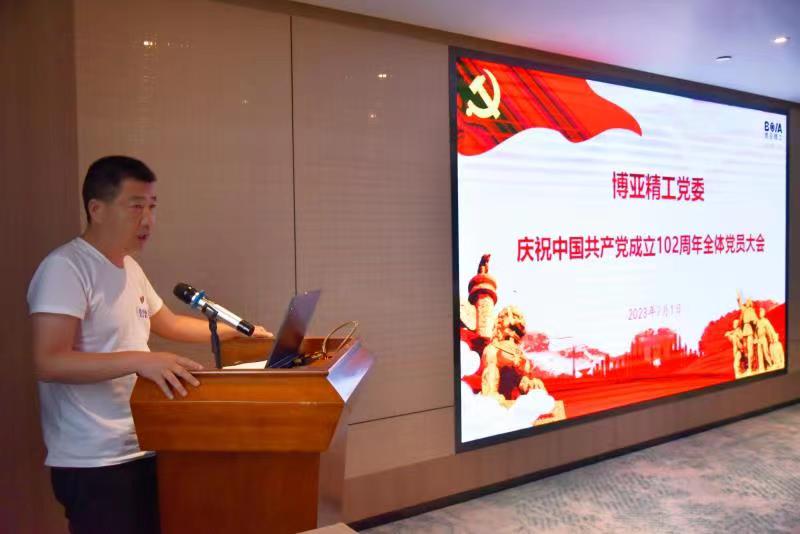 當(dāng)天晚上,在住宿酒店會(huì)議室組織召開了“慶祝建黨102周年全體黨員大會(huì)”。會(huì)議舉行了老黨員重溫入黨誓詞和預(yù)備黨員入黨宣誓儀式,黨委書記李總給預(yù)備黨員發(fā)放了《黨章》和《政治生日賀卡》。在會(huì)上表彰了公司2022—2023年度優(yōu)秀共產(chǎn)黨員,杜紅波、周微、馮攀、李波、劉軍5名同志獲此殊榮。隨后優(yōu)秀黨員代表劉軍作了表態(tài)發(fā)言,公司黨委委員輪流圍繞各自分管黨務(wù)工作談了認(rèn)識(shí)和體會(huì)。最后,黨委書記李總以《不忘“兩個(gè)務(wù)必”、牢記“三個(gè)務(wù)必”,奮力譜寫博亞“二次創(chuàng)業(yè)”新的絢麗華章,爭做市場(chǎng)經(jīng)濟(jì)條件下的道德模范》為題向大家講授了專題黨課。