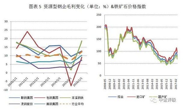 資源型鋼企的毛利率變動(dòng)與鐵礦石價(jià)格的變化趨勢(shì)一致,2013年之后受全球尤其是中國鋼鐵產(chǎn)能過剩影響鐵礦石價(jià)格快速下行,資源型鋼企的毛利率進(jìn)而惡化,且惡化趨勢(shì)要顯著大于行業(yè)平均水平。2016年下半年鐵礦石價(jià)格的回暖也帶動(dòng)資源型鋼企毛利的恢復(fù)。