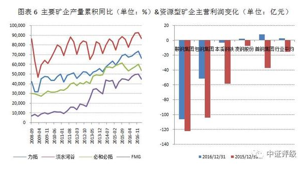 但從中長(zhǎng)期來看,資源型鋼企歷史上的相對(duì)競(jìng)爭(zhēng)優(yōu)勢(shì)已愈發(fā)不明顯,首先隨著國外淡水河谷、必和必拓等主流礦企2013年之前新建優(yōu)質(zhì)鐵礦的持續(xù)投產(chǎn)以及隨著國內(nèi)廢鋼累積率逐步提升對(duì)鐵礦石的替代作用不斷加強(qiáng),鐵礦石市場(chǎng)供求將逐漸步入買方市場(chǎng),國內(nèi)鐵礦石的品味和成本劣勢(shì)將越發(fā)明顯,資源型鋼企長(zhǎng)期依賴的競(jìng)爭(zhēng)優(yōu)勢(shì)或轉(zhuǎn)化為劣勢(shì)。從鐵礦石價(jià)格的變化趨勢(shì)可以看出,鐵礦石價(jià)格在2016年下半年持續(xù)回升,但已難以恢復(fù)到前期平均水平。本輪鋼鐵行業(yè)周期性回暖背景下,資源型鋼企盈利狀況的恢復(fù)明顯弱于行業(yè)平均。